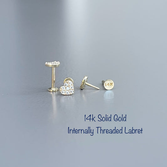 14k Solid Gold Full Paved CZ Heart Internally Threaded Labret